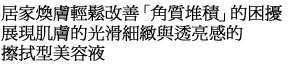 - 可溫和柔軟的去除「角質堆積」,讓使肌膚呈現晦暗的老化多餘角質,浮出肌膚表面,在不造成肌膚負擔下輕易去除角質的擦拭型美容液。